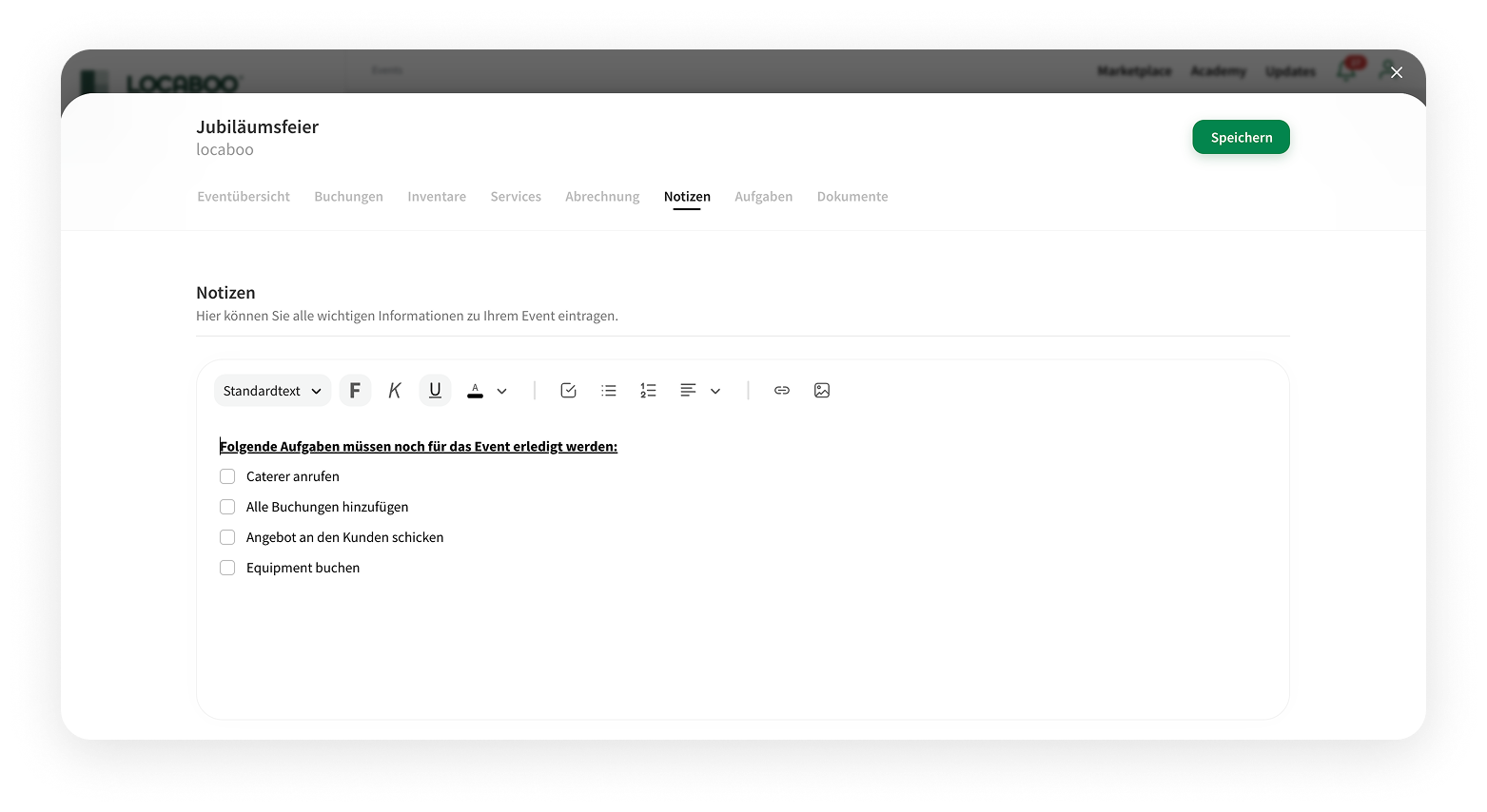 In den Event-Notizen können Sie alle Informationen rund um das Event festhalten.