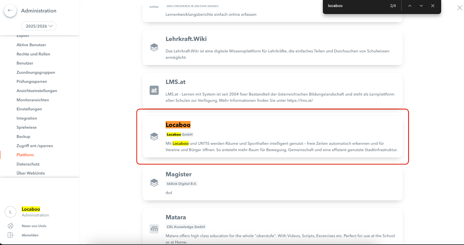 Nach Abschluss aller Schritte kehren Sie zur WebUntis Platform Seite zurück, wo Sie Locaboo als aktivierte Anwendung mit einem grünen Indikator (●) sehen können.