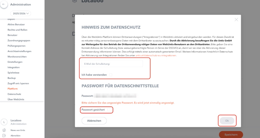 - Sie werden aufgefordert, das Passwort für die Datenschnittstelle zu speichern. Dies ist nicht notwendig, da dieses Passwort für die Webuntis-Locaboo Schnittstelle nicht relevant ist.