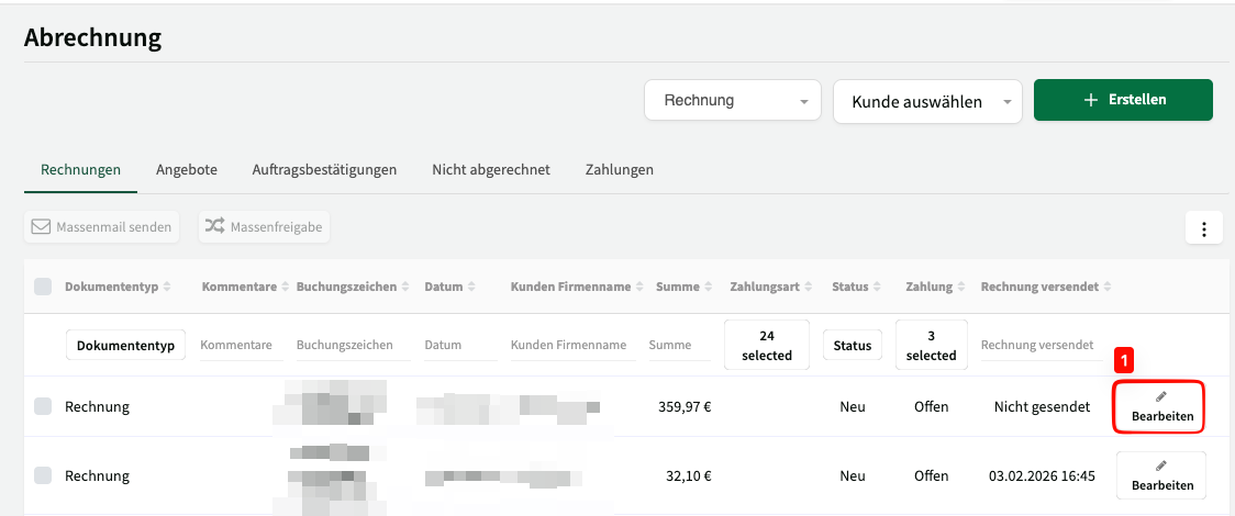 - Klicken Sie in der Übersicht aller Rechnungen bei einem einzelnen Dokument auf Bearbeiten > Stornieren.