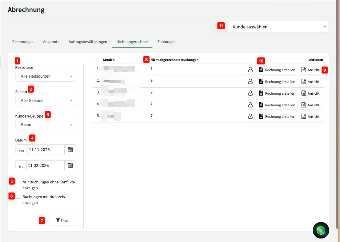 - Die Zahl in der Spalte Nicht abgerechnete Buchungen zeigt Ihnen wie viele Buchungen für die gewählten Filteroptionen zur Abrechnung bereit stehen.