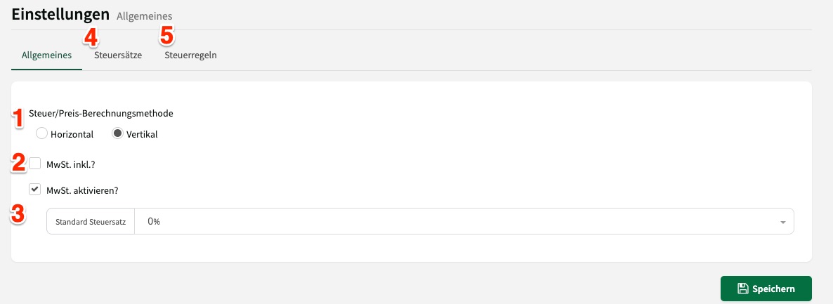 In der Steuerverwaltung können Sie die Steuer-Einstellungen für Ihren Locaboo-Account definieren. Sie finden die Steuerverwaltung unter "Einstellungen" / "Steuerverwaltung".