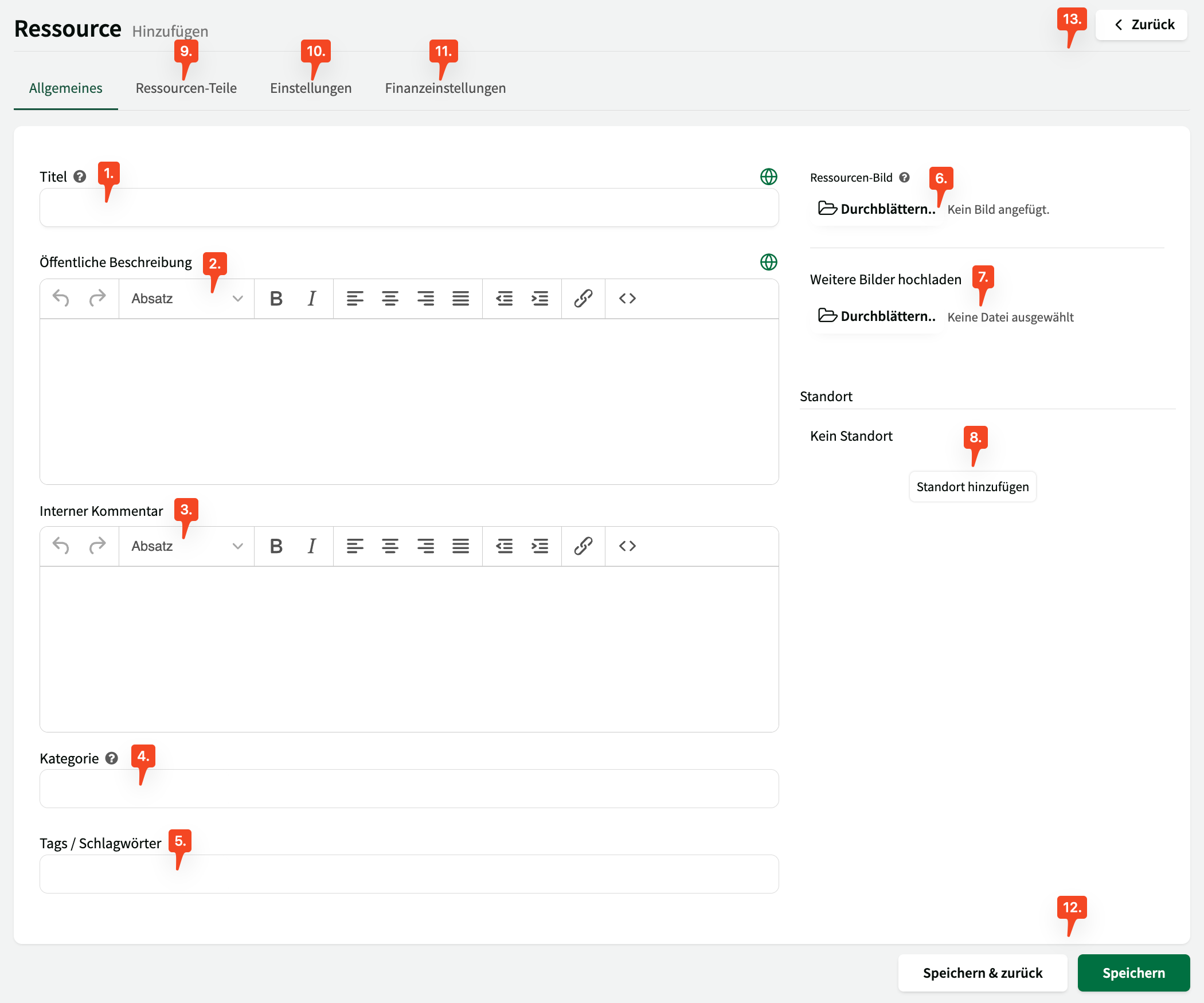 - Mit Tags / Schlagwörtern können Sie Ihre Ressourcen mit bestimmten Eigenschaften kennzeichnen, um diese später gezielt zu filtern, z.B. nach Ausstattung, Größe oder besonderen Merkmalen. (optional)